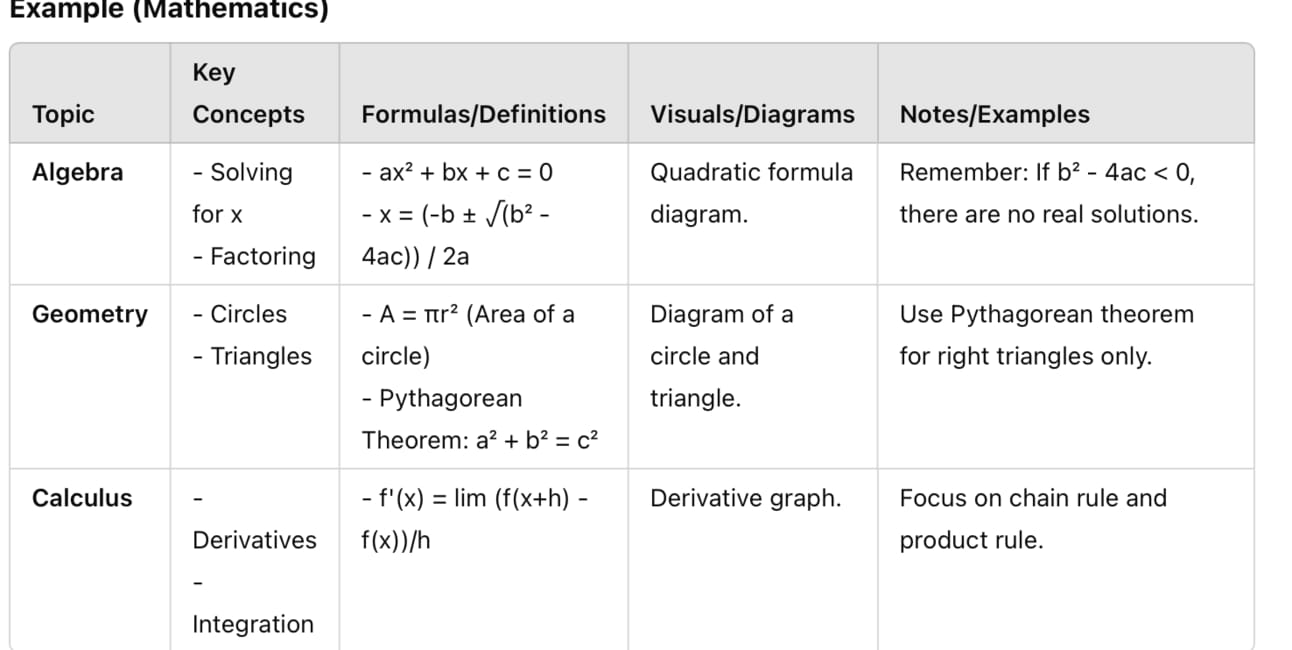 While I personally don’t have math exams, I still use cheat sheets for my other subjects. For me, I focus on bolding key answers or definitions, highlighting important sections, and using diagrams instead of just words. Diagrams help me visualize the concepts better and take up less space than written explanations. When I create my cheat sheet, I make sure to use every inch of space available to fit as much important info as possible.