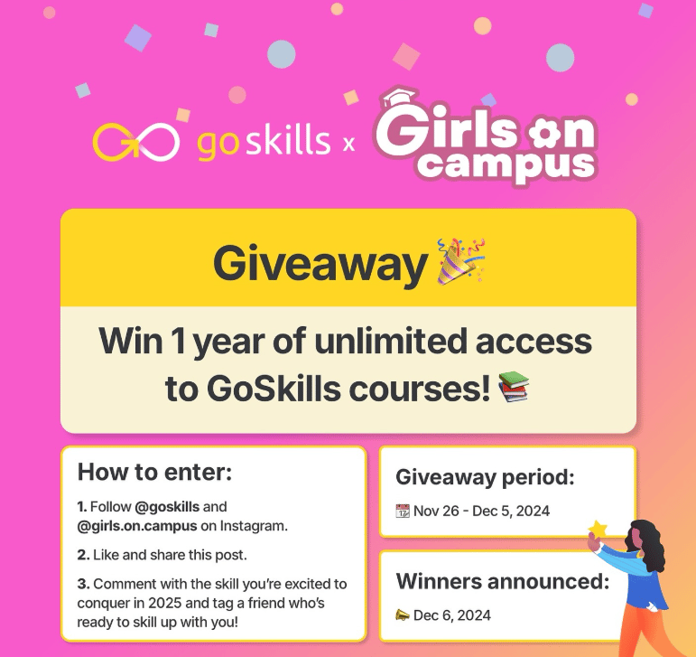 Our founder was the winner of the Bold Scholarship by GoSkills. GoSkills, similar to Coursera, offers certificate programs for skill training. They wanted to support Girls on Campus by giving away 5 one-year memberships to students interested in learning new skills. These certifications can be applied to internships, jobs, or even for high school students to explore career opportunities.